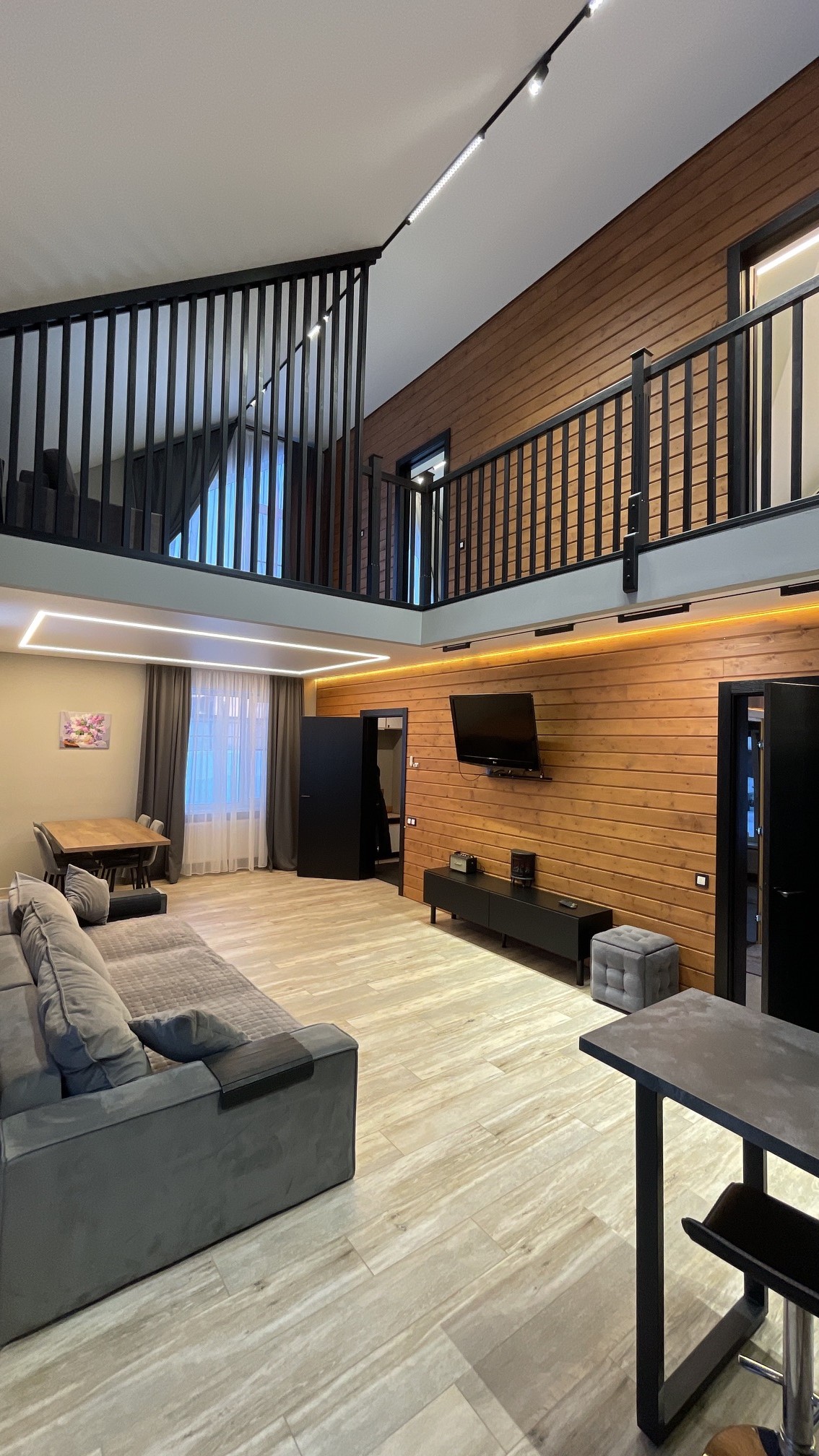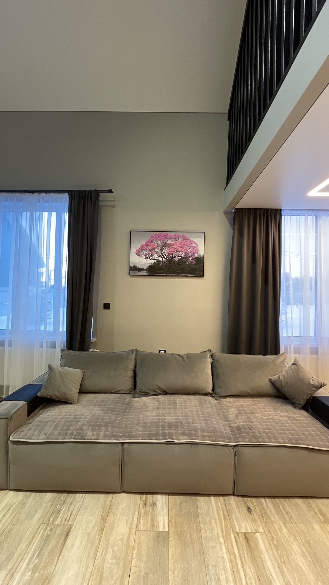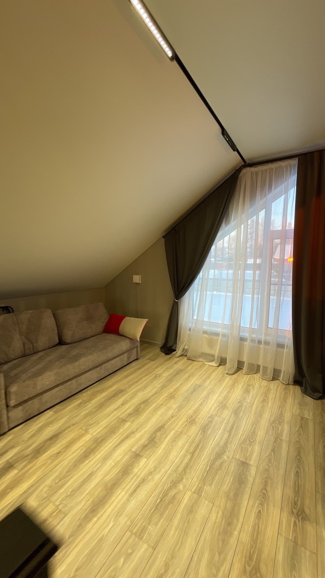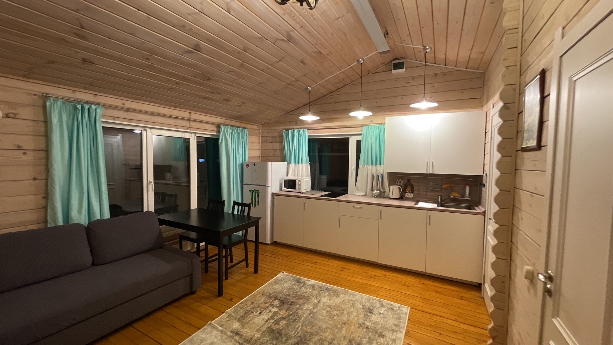 Тут нам удалось вместить большой 3-х метровый диван, на котором с легкостью разместятся четверо взрослых гостей!