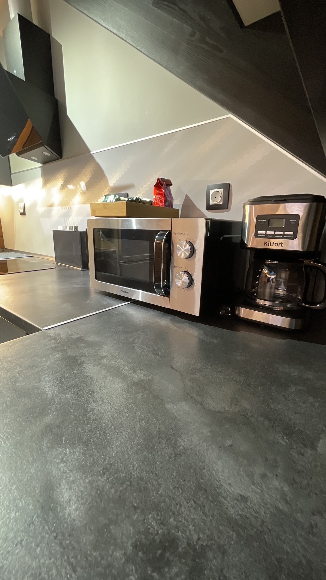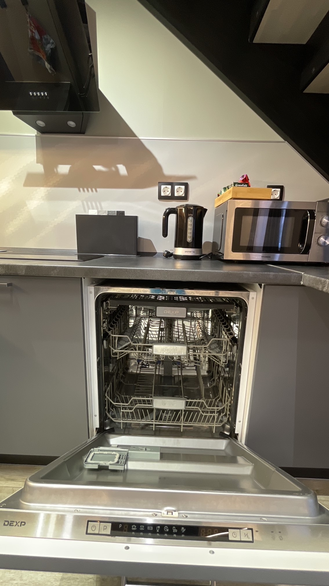 Так-же в этой зоне имеется обеденный стол и небольшая кухня со всем необходимым оборудованием. (кофеварка, посудомойка и т.д.)